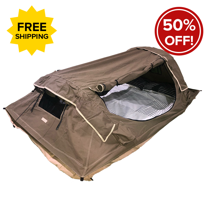 The main tent body is made from a resilient, rip-stop & waterproof 340gsm cotton canvas. This swag comes with tie down pegs & ropes included to keep your swag secure no matter the weather. The included ground sheet is made from a tough waterproof PVC & is attached to the swag itself so you don’t have to worry about setting it up when getting your swag ready.